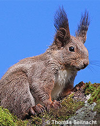 Aus der Gattung Sciurus, der Eichhörnchen, sind weltweit rund 30 Arten bekannt. Das in Europa lebende Eichhörnchen wird auch Eurasisches Eichhörnchen genannt. Das Kaukasische Eichhörnchen Sciurus anomalus Güldenstädt lebt in Südosteuropa und in Südwestasien bis zum Kaukasus. Bei ihm ist das Fell nur auf der Oberseite grau, auf den Seiten verläuft ein rötliches Band, während das Fell hinten dunkel erscheint. Das Kalabrische Eichhörnchen Sciurus meridionalis Lucifero lebt fast ausschließlich in Kalabrien im Süden Italiens. Das Fell erscheint mit Ausnahme des weißen Bauchs überall schwarz. Auch das ursprünglich im Mittleren Westen der USA und im Südosten Kanadas beheimatete Grauhörnchen Sciurus carolinensis Gmelin zählt zur Gattung der Eichhörnchen. Es hat sich als Neophyt in England und Irland eingebürgert. Man erkennt es an dem oberseits grauen und bauchseits hellen Fell. Im Winter fehlen die Haarbüschel an den Ohren.