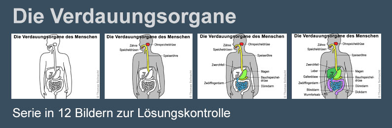 Über die Speiseröhre gelangt die so schon leicht vorverdaute Nahrung in den Magen. Dort werden die Eiweiße aufgespalten. Auch die Enzyme aus der Mundschleimhaut sind im Magen noch eine Weile wirksam. Die Muskeln der Magenwand durchmischen die Nahrung und transportieren sie in den ersten Teil des Dünndarms, den Zwölffingerdarm. Das Zwerchfell trennt die Verdauungsorgane von den Atmungsorganen und unterstützt die Atmung.