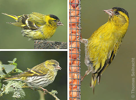 Zeisigmännchen (oben links) und Zeisigweibchen (unten),