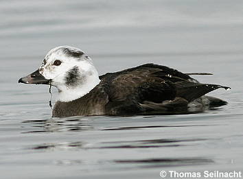 Die Eisente ist die kleinste europäische Tauchente. Der Schnabel am kleinen, runden Kopf ist am Ende fleischfarben gefärbt und trägt am Ansatz ein dunkles Band. Das Männchen hat einen langen, spießartigen Schwanz. Die Farbe des Gefieders variiert je nach Geschlecht und Jahreszeit. Als Besonderheit tragen die Eisenten ihr Prachtkleid im Winter. Dann erscheint das Männchen schwarz-weiß gemustert. Insgesamt wechseln die Eisenten bis zu dreimal im Jahr ihr Gefieder. Andere Individuen wechseln ständig ihr Aussehen, so dass es viele Formen und Farben gibt. Das Foto oben zeigt eine männliche Eisente. Unten ist ein weibliche Eisente im Winter auf einem Schweizer See zu sehen.