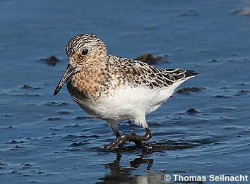 gesprenkelt. Im Schlichtkleid wirkt der Sanderling sehr hell. Er ruft